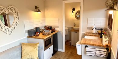 Whilst Llangollen town is only 5 mins drive away, you might prefer to enjoy the peace and quiet. Our hut has full cooking facilities, including a hob, microwave, kettle, toaster, fridge and sink. We also provide pots and pans, cups, glasses, tea, coffee and fresh milk.